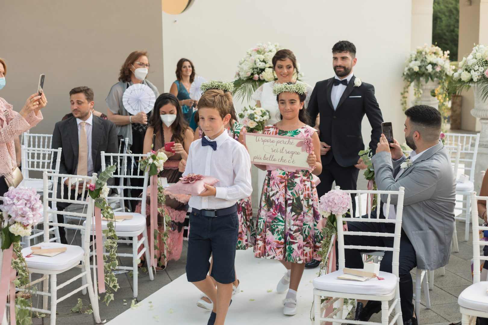 Terminata la prima e intensa fase del Covid iniziano i preparativi del matrimonio civile con tanto di rito simbolico ed io nei panni di officiante. Ci troviamo a Villa Montesano sotto un platano secolare, tutto si tinge di rosa come il dress code, i nastri, le rose, il progetto cartaceo, la wedding cake e le proiezioni sulla facciata. Tutto diventa emozione con la voce di un soprano e le parole di un testo poetico scritto dalla coppia. Un porta fedi cucito a mano, due damigelle e un pagetto precedevano la sposa con un sorriso dolcissimo e una delicatezza unica. Un matrimonio, quello di Tiziano e Michela, tanto atteso e desiderato dal loro angelo custode.